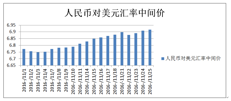 另一個值得關注的因素是人民幣對美元的匯率。因美元指數(shù)上漲,美元相對于世界其他主要貨幣日元、英鎊和人民幣等幣種升值較多, 造成日元較前貶值9%,人民幣跟跌,11月以來的人民幣對美元匯率柱狀圖體現(xiàn)尤為明顯。