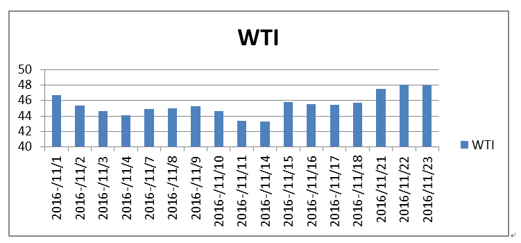 進入11月末以來, 行業(yè)人士預測OPEC落實減產(chǎn)協(xié)議的可能性增大,原油價格呈現(xiàn)上漲趨勢。11月30日, OPEC將在維也納召開第171屆例會,最后確定落實具體減產(chǎn)執(zhí)行細則,作為世界最大產(chǎn)油國之一的和非OPEC成員國的俄羅斯也可能參加此次會議,加入減產(chǎn)的行列。此前,反對減產(chǎn)或免除減產(chǎn)義務的伊朗等OPEC成員國釋放出了更多的善意,國際上普遍對此次會議成果寄予厚望。一旦減產(chǎn)協(xié)議落地,無疑將有力提升原油價格。2016年9月28日, OPEC就成員國減少原油產(chǎn)量達成原則性協(xié)議以來,國際原油價格起跌連連。國際原油主要基準價美國西德克薩斯中質原油(WTI) 本月的柱狀圖反映了這一基本面。