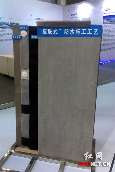 “這是我們的‘皮膚式’防水施工工藝模型,這項(xiàng)工藝運(yùn)用到地鐵車(chē)站建設(shè)中,防水效果優(yōu)于傳統(tǒng)工藝?!爆F(xiàn)場(chǎng)工作人員介紹,該工藝通過(guò)噴涂速凝橡膠瀝青防水涂料成膜后,與混凝土粘接力強(qiáng),可有效避免滲水,并具有良好的阻水能力和釘孔自密性,長(zhǎng)時(shí)間內(nèi)對(duì)細(xì)小破壞具有自愈性,形成真正的“皮膚式”防水。目前,這項(xiàng)工藝已經(jīng)成功運(yùn)用到長(zhǎng)沙地鐵4號(hào)線漢王陵公園站施工過(guò)程中。