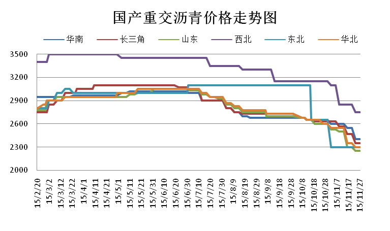 華南地區(qū),受周邊工程需求支撐,瀝青整理需求尚可,但是迫于整體下行的大趨勢,本周該地區(qū)瀝青價格跌至2350元/噸左右。