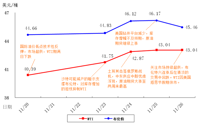 截至11月26日收盤,WTI區(qū)間41.75-43.04,布倫特區(qū)間44.83-46.17美元/桶。