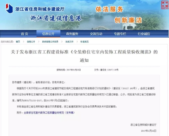 日前,浙江省住房和城鄉(xiāng)建設廳發(fā)布通知:由浙江省建筑裝飾行業(yè)協(xié)會等單位主編的浙江省工程建設標準《全裝修住宅室內(nèi)裝飾工程質(zhì)量驗收規(guī)范》已正式通過審查、公示,批準為全省工程建設標準,自2017年7月1日起施行。