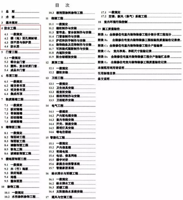 《規(guī)范》附件共103頁,對全裝修如防水、門窗、吊頂、輕質(zhì)隔墻、墻飾面工程、樓地面飾面工程、細部工程、廚房工程、衛(wèi)浴工程、電氣工程、智能化工程、給水排水與采暖工程、通風與空調(diào)工程、室內(nèi)環(huán)境污染控制等十三大類進行了各方面的詳盡闡述。