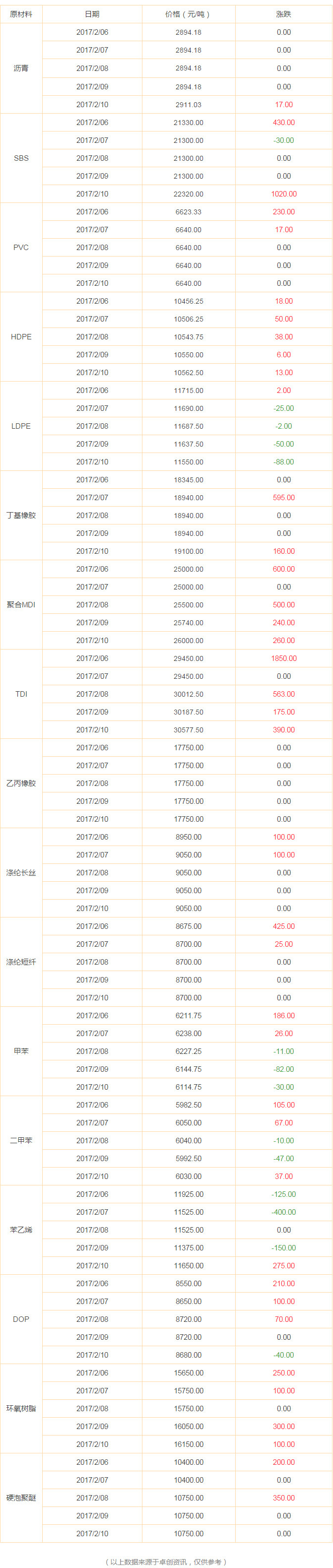 SBS\MDI\TDI價格節(jié)后飆漲、其余普漲,防水材料原輔材料價格走勢(2.6—2.10)