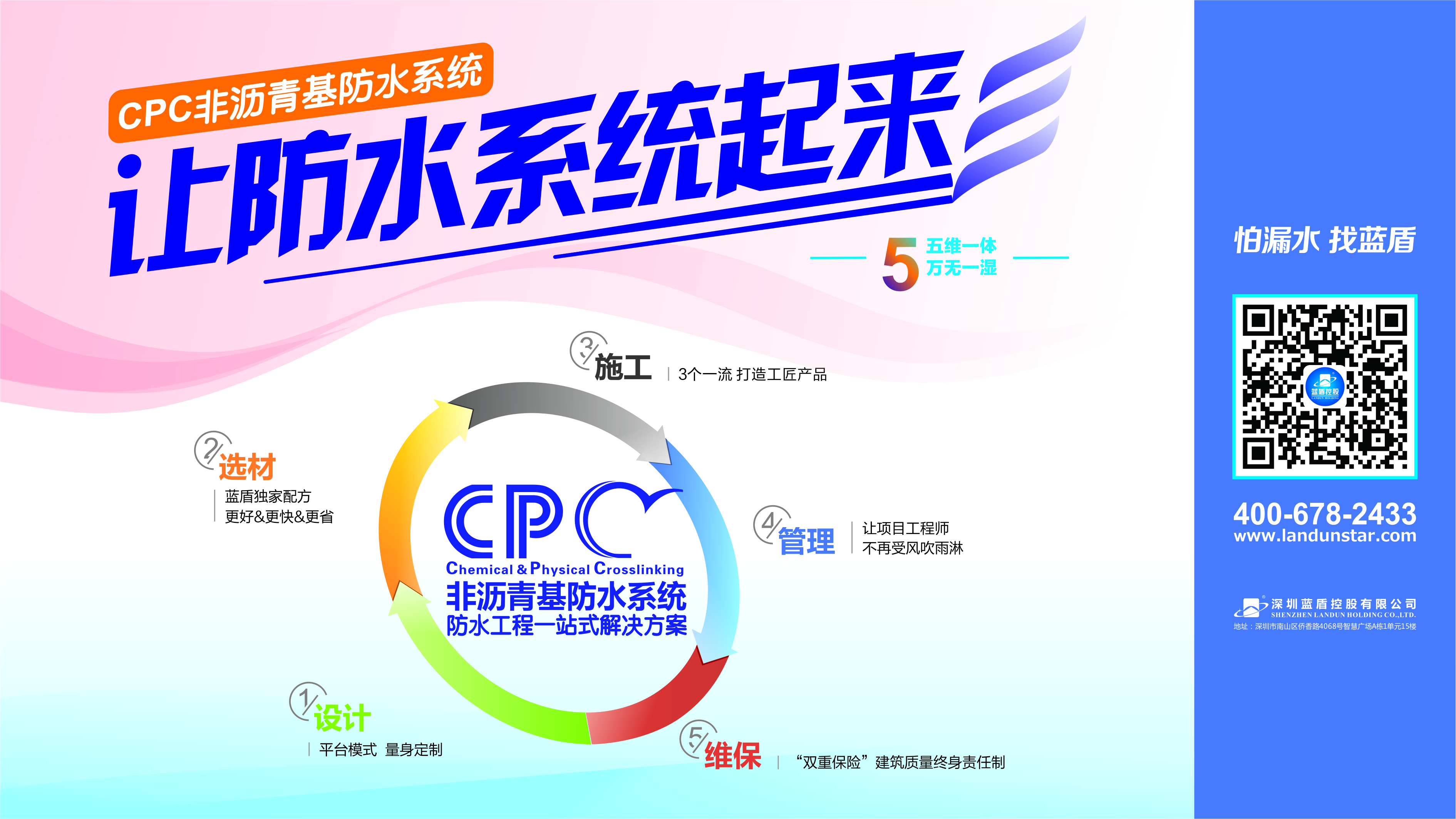 2015年,藍(lán)盾推出“CPC非瀝青基防水系統(tǒng)”,該系統(tǒng)將設(shè)計(jì)、材料、施工、管理、維保貫穿防水工程全過程,形成五維一體的系統(tǒng)化服務(wù),為防水工程提供一站式解決方案。藍(lán)盾實(shí)現(xiàn)了從防水材料供應(yīng)商到系統(tǒng)服務(wù)商的轉(zhuǎn)型,致力于成為行業(yè)領(lǐng)先、最受信賴的防水系統(tǒng)服務(wù)商。