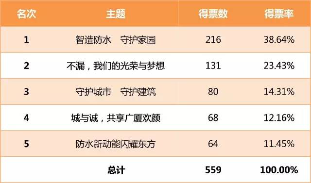 323-31日,票選活動(dòng)得到了親們的積極參與和大力支持,在此,防水君必須給您深深滴鞠上一躬。截至33123時(shí)59分,通過(guò)中國(guó)建筑防水協(xié)會(huì)官方微信公眾號(hào)及中國(guó)建筑防水協(xié)會(huì)官網(wǎng),共有559人次參與投票。其中“智造防水 守護(hù)家園”得到216位親的支持,占總投票數(shù)的近四成,位列第一;“不漏,我們的光榮與夢(mèng)想”得到131位親的支持,占總投票數(shù)的兩成多,排名第二?!爸窃旆浪斌w現(xiàn)了咱們防水人對(duì)高品質(zhì)的追求,“守護(hù)家園”是咱們的社會(huì)責(zé)任,而“不漏”則是行業(yè)的終極目的,當(dāng)選主題能夠充分體現(xiàn)全體防水人的訴求和夢(mèng)想。