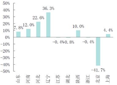 各地區(qū)中,遼寧地區(qū)的瀝青類防水卷材累計(jì)產(chǎn)量增長(zhǎng)最快,為30.0%。有兩個(gè)地區(qū)的累計(jì)產(chǎn)量出現(xiàn)負(fù)增長(zhǎng),其中北京地區(qū)累計(jì)產(chǎn)量下降34.4%。