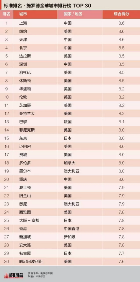 在全球161個參評城市中,中國內(nèi)地城市表現(xiàn)卓越,超大型城市占據(jù)了前六席中的四席,上海、天津、北京和深圳分別排在第一、第三、第四和第六位,美國的紐約和達拉斯分別排在第二、第五位。