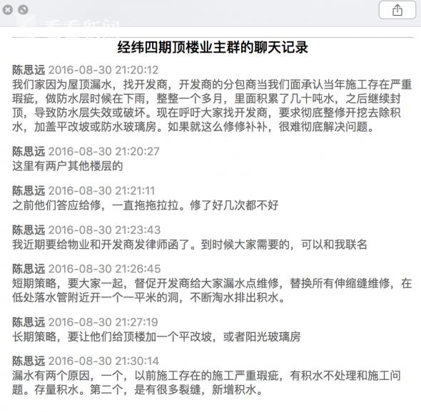 今年8月中旬,由于經(jīng)緯四期15號樓頂樓滲水嚴(yán)重,物業(yè)和開發(fā)商打開屋頂一塊區(qū)域后,發(fā)現(xiàn)了頂樓防水層積水的情況。15號樓頂樓業(yè)主陳先生在微信群中反映,開發(fā)商的分包商曾當(dāng)面承認(rèn)當(dāng)年施工存在嚴(yán)重瑕疵:“做防水層時候在下雨,整整一個多月,里面積累了幾十噸水,之后繼續(xù)封頂,所以導(dǎo)致防水層失效或破壞?!?/span>