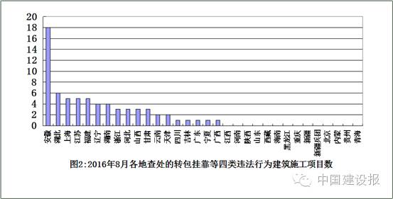 從查處的轉(zhuǎn)包、掛靠等四類違法行為看,安徽、湖北省查處項(xiàng)目相對較多(見圖2)。
