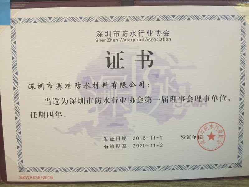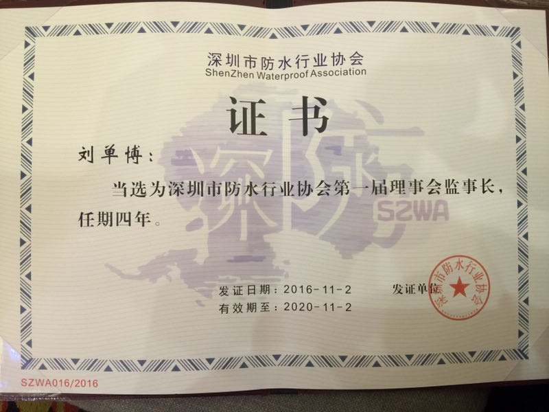 成都賽特深圳分公司總經(jīng)理劉單博當(dāng)選為深圳市防水行業(yè)協(xié)會(huì)第一屆“理事會(huì)監(jiān)事長(zhǎng)”。