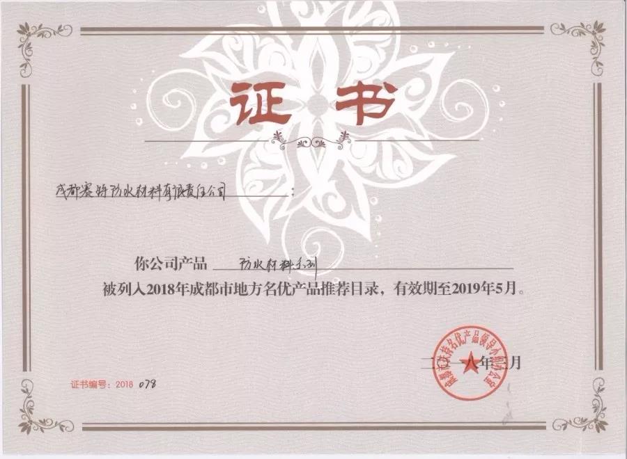 賽特防水防水材料系列產(chǎn)品經(jīng)各區(qū)(市)縣經(jīng)信部門和有關(guān)行業(yè)商協(xié)會初審,并通過市工商部門部門、市質(zhì)監(jiān)部門意見,全部入選2018年《成都市地方名優(yōu)產(chǎn)品推薦目錄》。