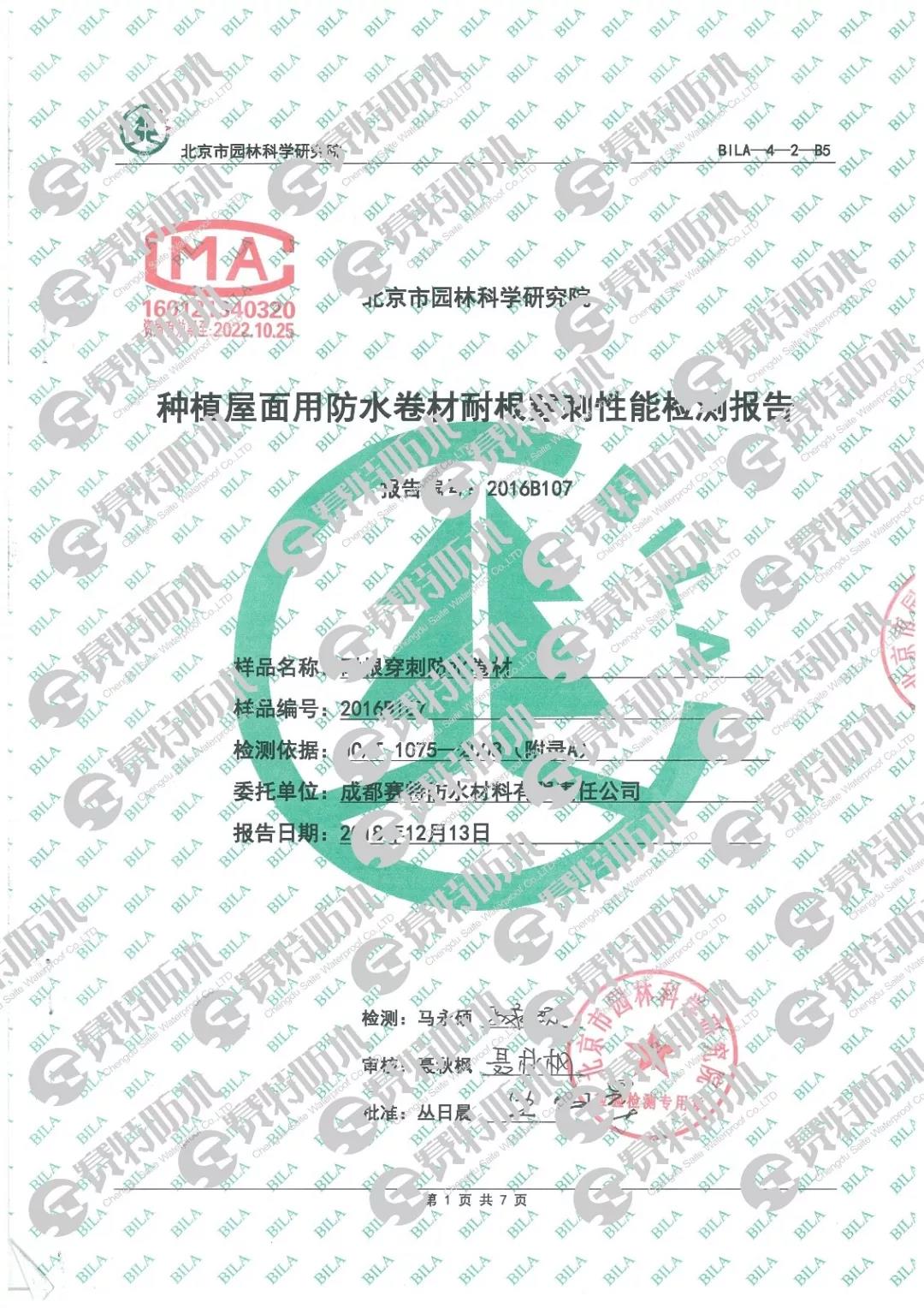 2018年12月17日,北京市園林科學(xué)研究院官網(wǎng)發(fā)布了防水卷材耐根穿刺性能測試合格產(chǎn)品最新公告,賽特防水耐根穿刺防水卷材產(chǎn)品順利通過測試。北京市園林科學(xué)研究院根據(jù)《種植屋面用耐根穿刺防水卷材》(JC/T1075-2008)規(guī)定的實驗方法,進(jìn)行了為期兩年的耐根穿刺實驗。兩年間不斷的對植物生長情況進(jìn)行監(jiān)測,期滿后正式開箱檢測。賽特防水產(chǎn)品順利通過性能檢測,標(biāo)志著公司對產(chǎn)品質(zhì)量穩(wěn)定性的良好把控,對產(chǎn)品創(chuàng)新的不斷追求。種植屋面防水工程對材料要求十分苛刻,其中耐植物根穿刺防水層一定要使用符合耐根穿刺性能要求的防水卷材。