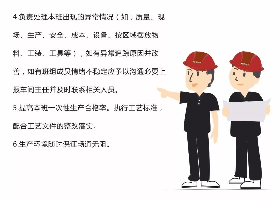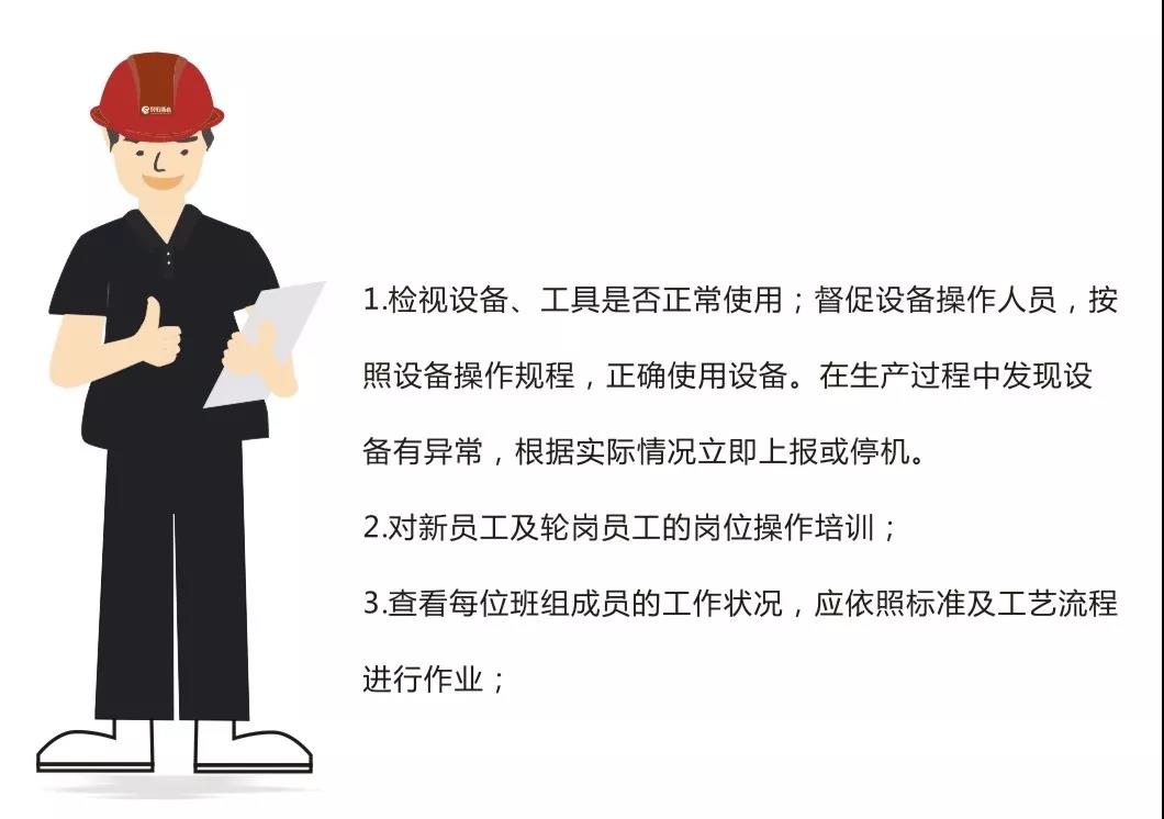 負(fù)責(zé)分解落實生產(chǎn)任務(wù),嚴(yán)格按工藝文件和設(shè)備操作規(guī)范組織生產(chǎn),合理安排生產(chǎn)人員、強化現(xiàn)場管理,提高生產(chǎn)效率;負(fù)責(zé)班組團隊、安全文化建設(shè)和規(guī)范化管理等其他職責(zé)。