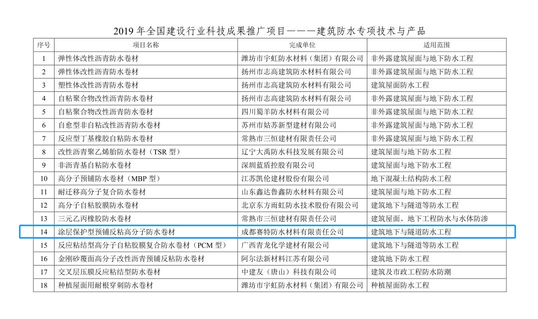 12月4日——12月10日,住房和城鄉(xiāng)建設部科技發(fā)展促進中心公示了2019年全國建設行業(yè)科技成果推廣項目。賽特防水自主研發(fā)生產的 PAS-400 Pro1涂層保護型預鋪反粘高分子防水卷材順利通過國家科技成果評估,上榜2019年全國建設行業(yè)科技成果推廣項目(建設領域唯一的國家推廣項目)。