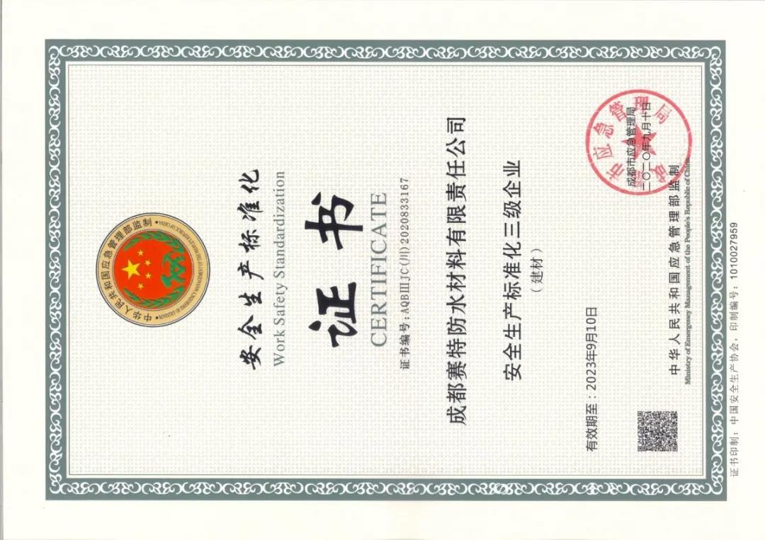 賽特自成立以來,聚焦于產(chǎn)品品質(zhì)提升,堅持將安全生產(chǎn)工作作為重點(diǎn),設(shè)立安全小組,全面負(fù)責(zé)公司安全生產(chǎn)工作,并不斷強(qiáng)化全員安全生產(chǎn)教育培訓(xùn),在公司安全生產(chǎn)標(biāo)準(zhǔn)化上面做出了一系列努力。公司啟動安全標(biāo)準(zhǔn)化工作以來,在各部門高度重視及積極支持配合下,在安全管理人員的努力和付出下,落實(shí)了一系列安全生產(chǎn)標(biāo)準(zhǔn)化相關(guān)工作。今年,公司獲得“安全生產(chǎn)標(biāo)準(zhǔn)化三級企業(yè)(建材)”認(rèn)證。
